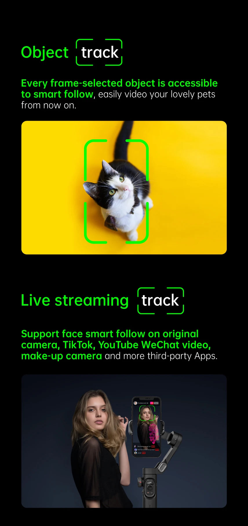 Smart tracking keeps you centered in the frame, ideal for live streaming, video calls, and solo content creation.