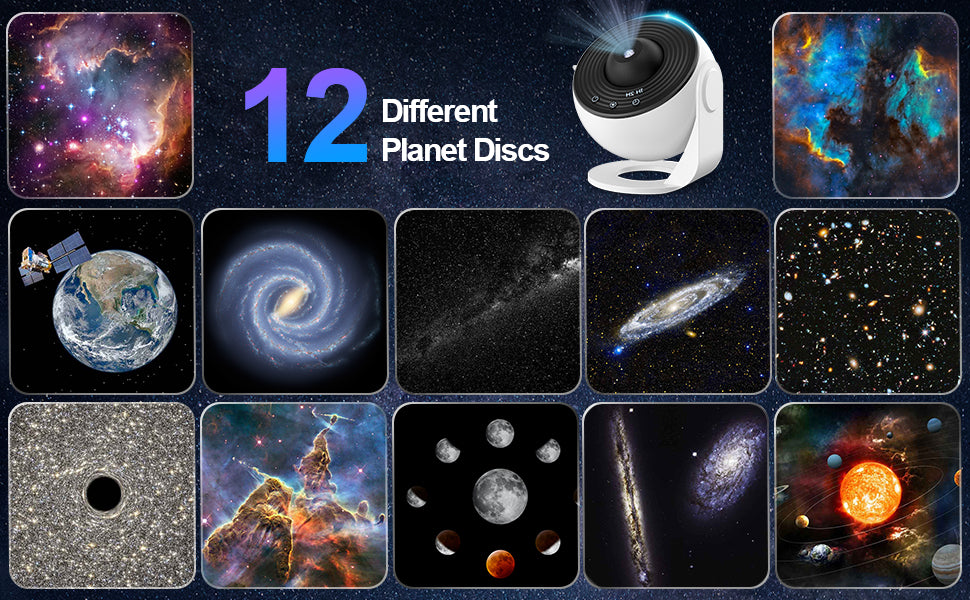 13-in-1 planetarium star projector: this bedroom galaxy projector offers 12 display scenarios, including the solar system, earth, moon, milky way, galaxy, Andromeda galaxy, NGC4302-NGC4298, the Hubble Deep Field, M60--UCD1, the North American Nebula, the Mystery ic ic Mountain ic Magellanic Cloud You can put it in your living room or bedroom to add a touch of technology to your home.